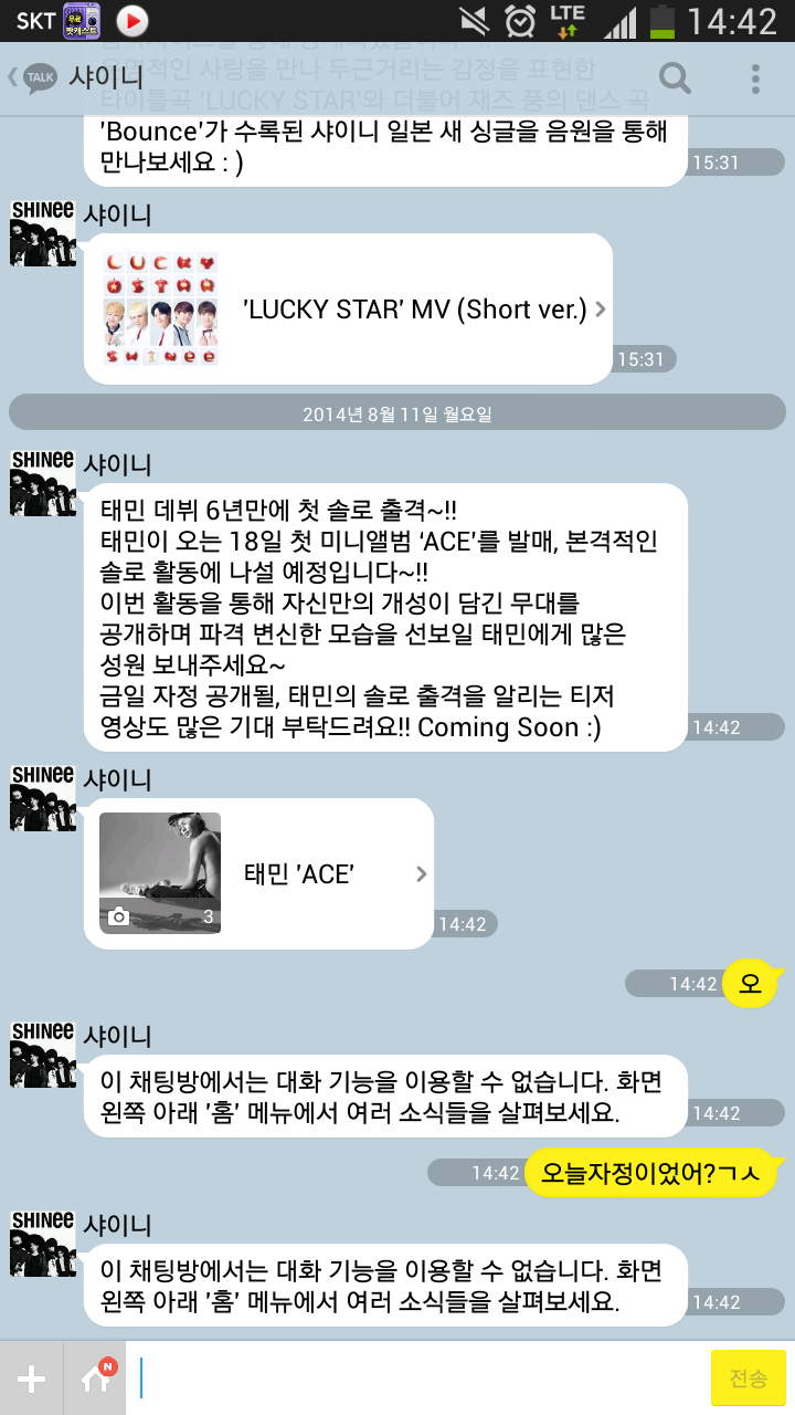 SHINee Kakaotalk zenet: Figyelmeztets, hogy itt nem tud beszlgetni, de tovbbi informcihoz juthat a Home gombbal.